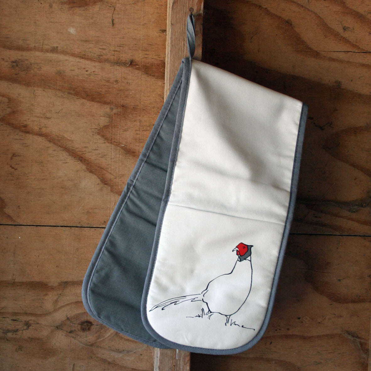 The pheasant double oven gloves from Cluck Cluck feature 'Who, me?' pheasant design on the pockets with the reverse side printed grey.