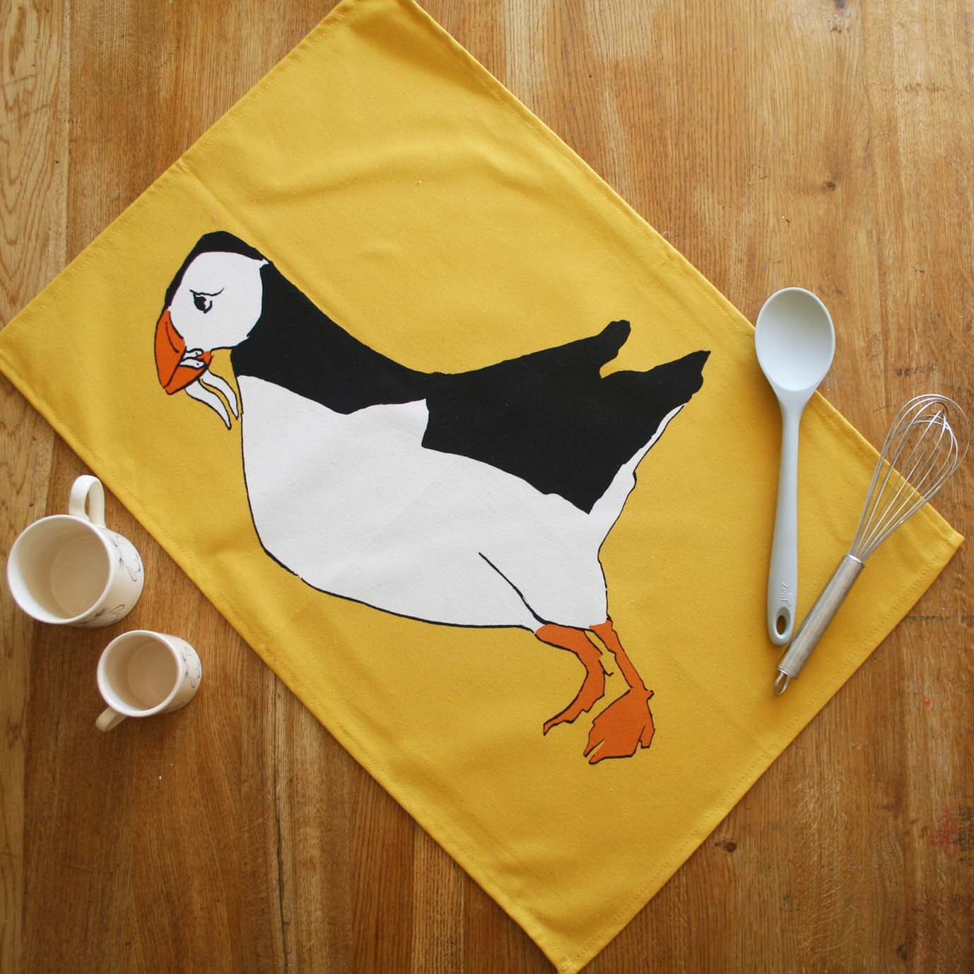 The Puffin tea towel features a cheeky puffin with his tea! The mustard yellow background really sets off the design of this character eating his snack of fish.