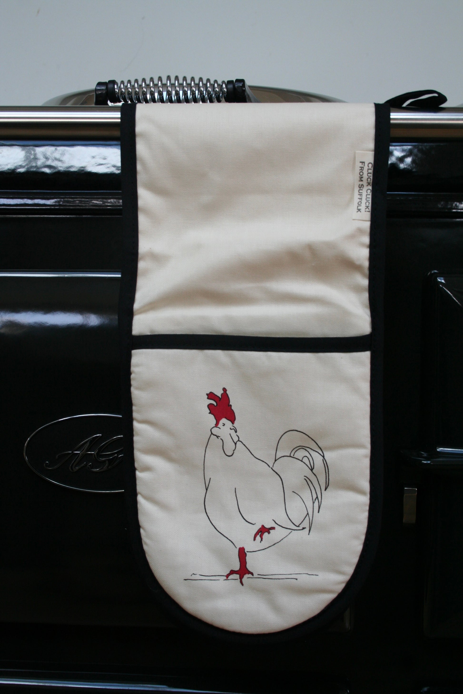 The set of double oven gloves are made with natural cotton and have a screen printed image of a cockerel with cream underside, edged in black. Tucked inside is a hen tea towel and wooden spoon.