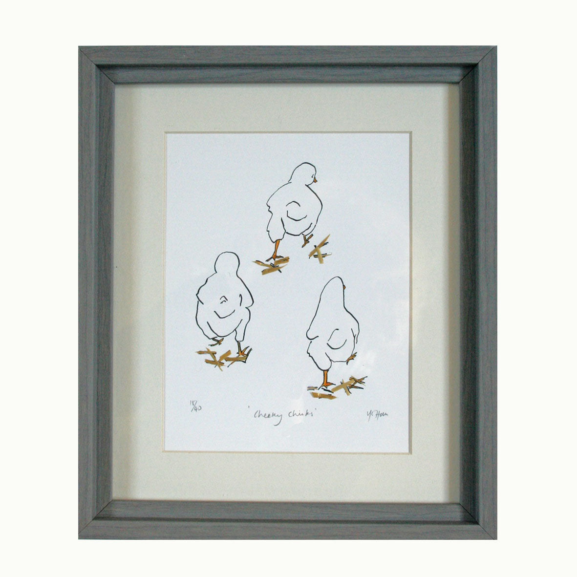 The signed Cheeky Chicks prints are available mounted or framed. They are an edition of 40, hand finished with watercolour and straw. It is a popular christening gift.