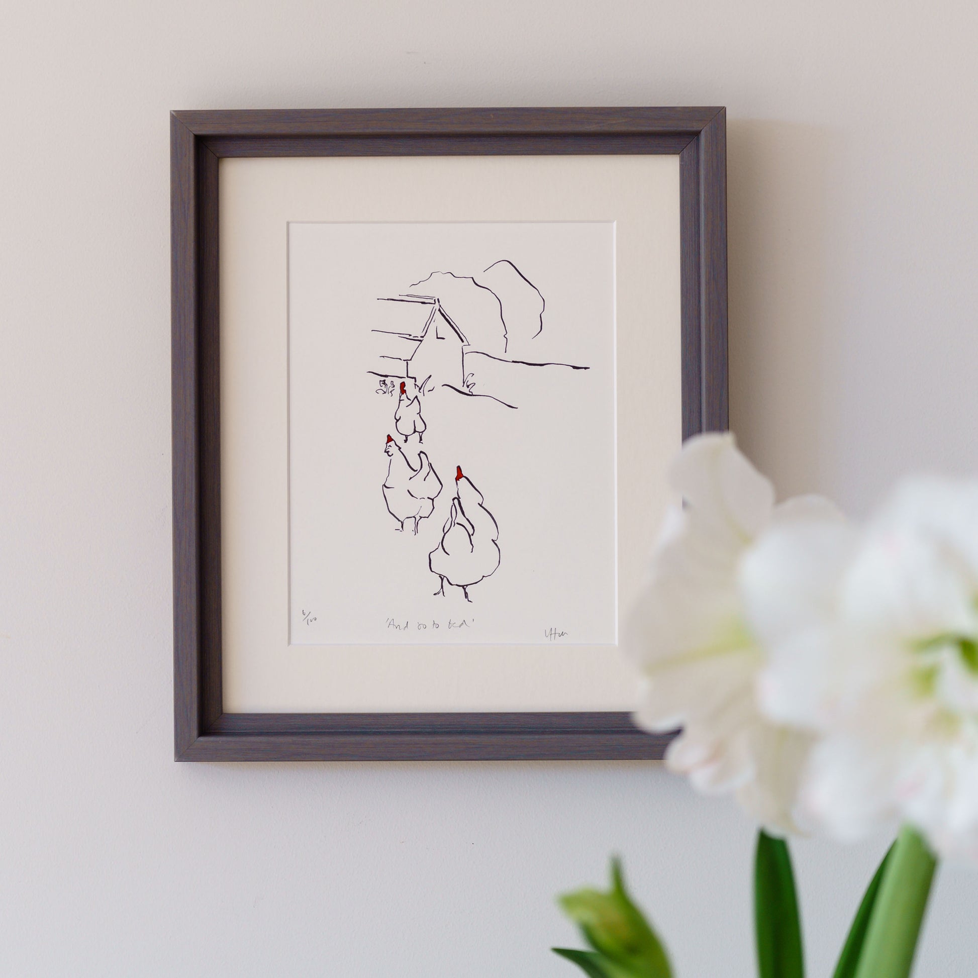 The signed 'Hens at Home' prints are of my hens in the garden at home. The design is also on our New Home card.