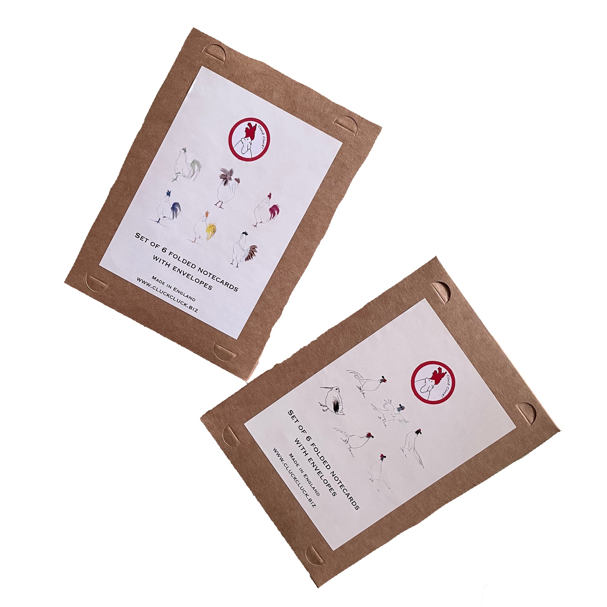 The set of 6 different colourful chickens cards with envelopes come in a kraft gift box. The cards are 17.5cm by 12.5 cm and blank inside.