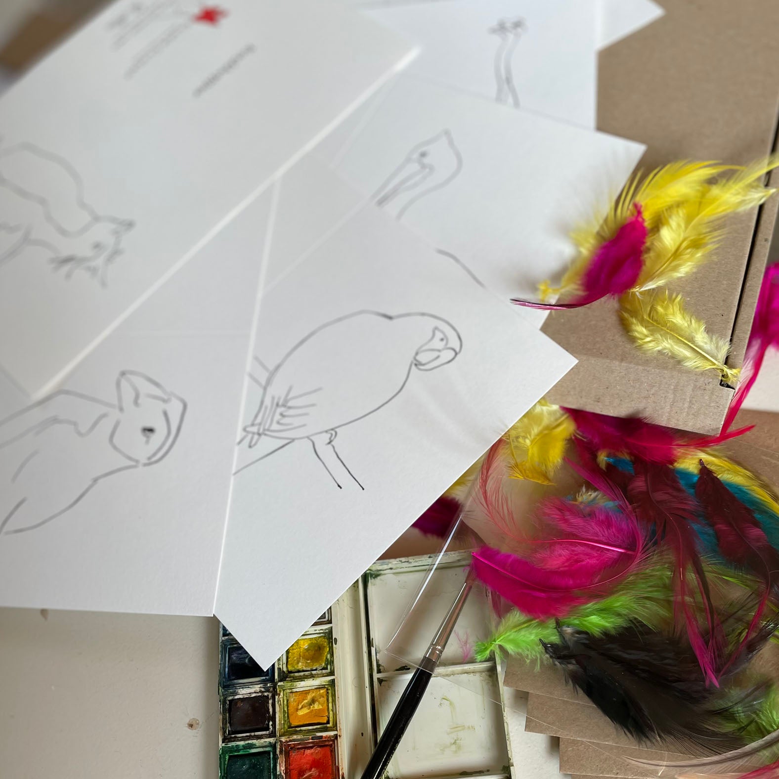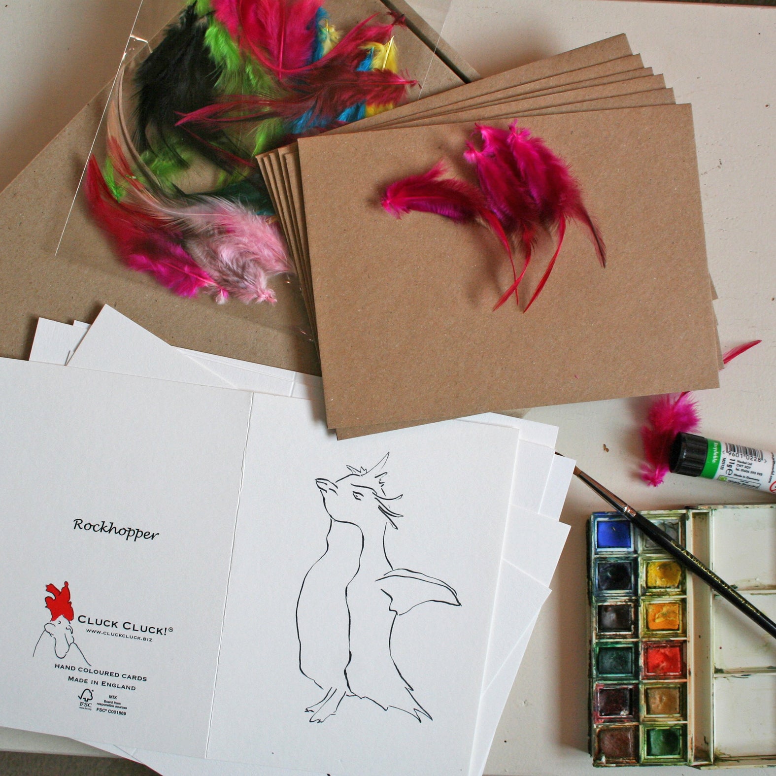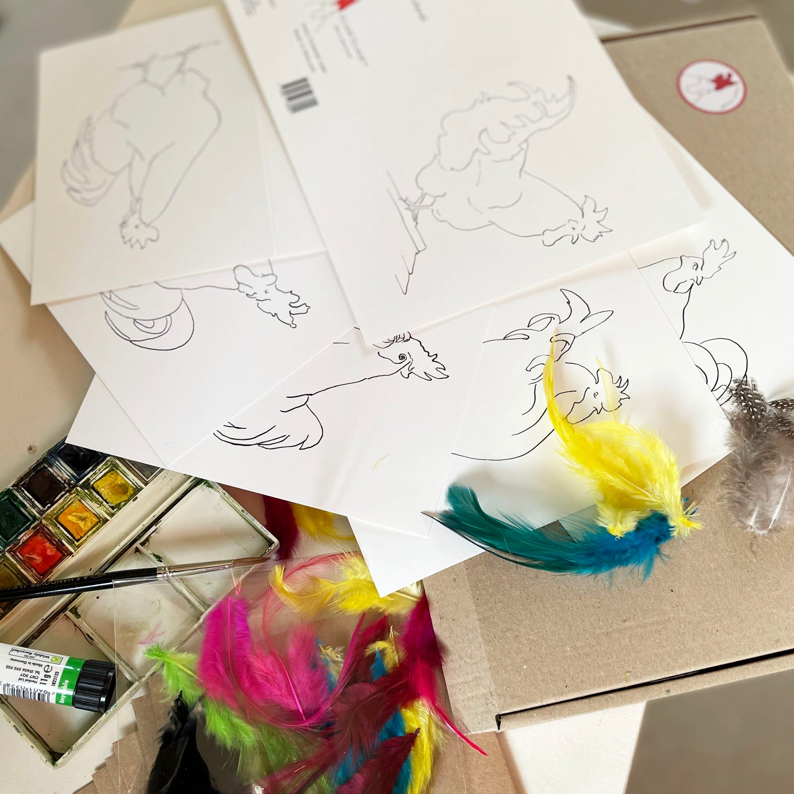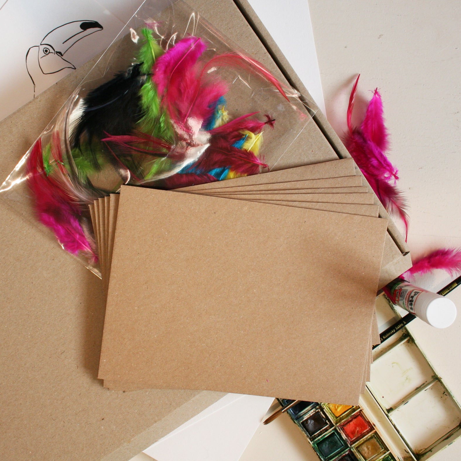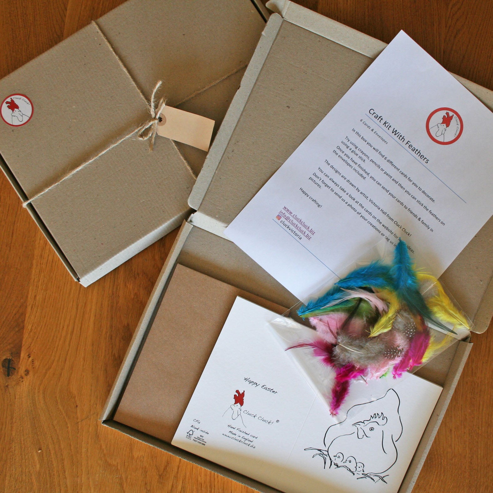 The kits come in a kraft gift bag with 6 different cards and envelopes including a bag of colourful feathers to decorate. Great Christmas activity.