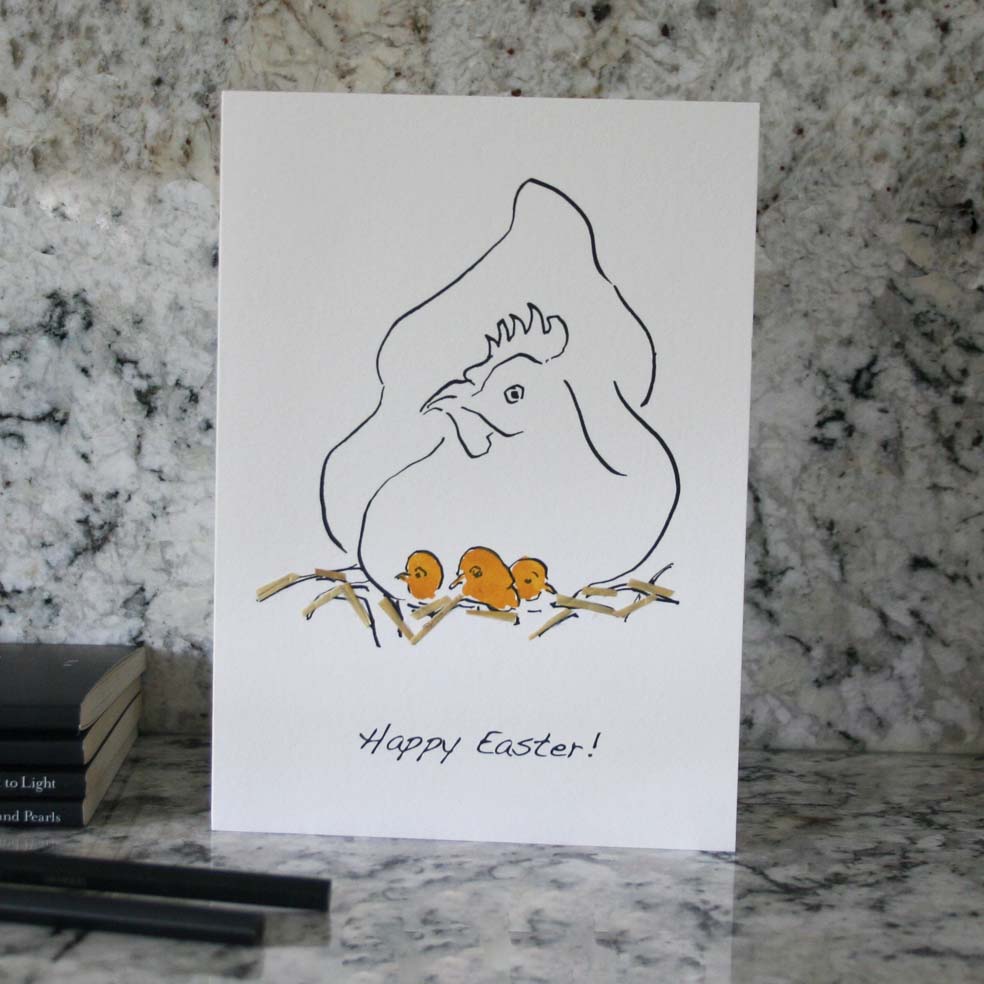 The Easter card shows a mother hen keeping her chicks happy on the nest with Happy Easter written along the bottom of the card. It is also available without text.