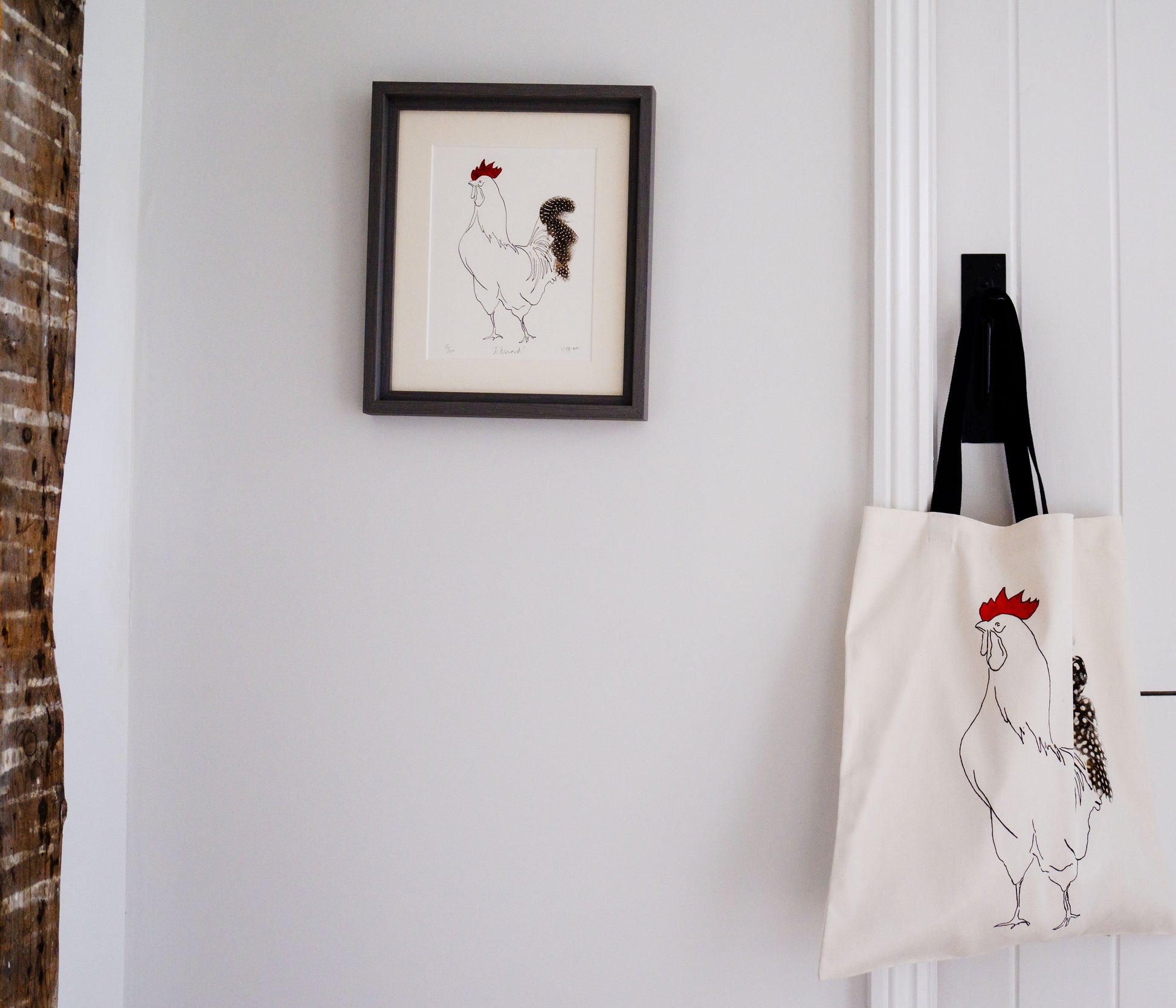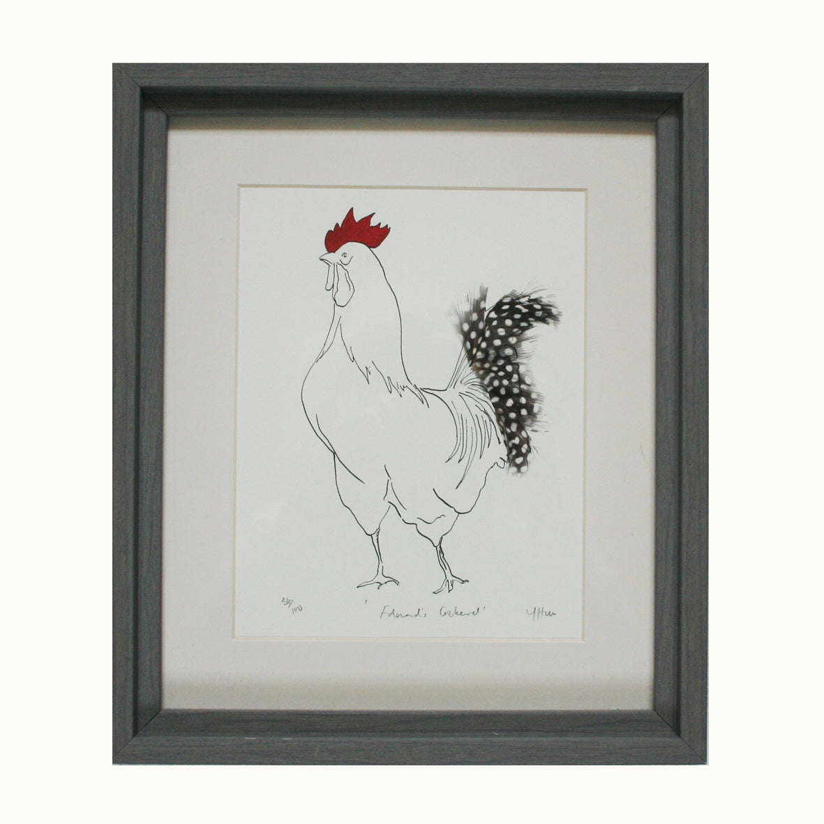 The signed Edward the cockerel prints are hand finished with watercolour and real guinea fowl feathers. The cockerel belonged to a little boy at my children's school, who was called Edward! Sadly the fox got him the week after I had drawn him.