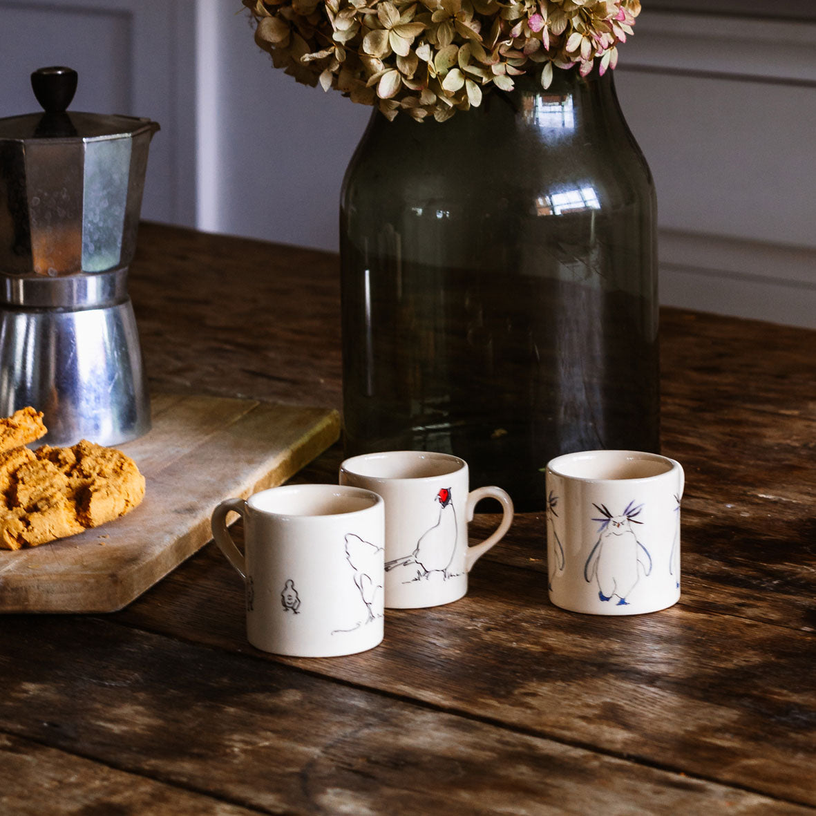 The espresso cups are available in Chicken, Pheasant, Runner duck and Penguin design. 125 ml and come in kraft sealed gift box.