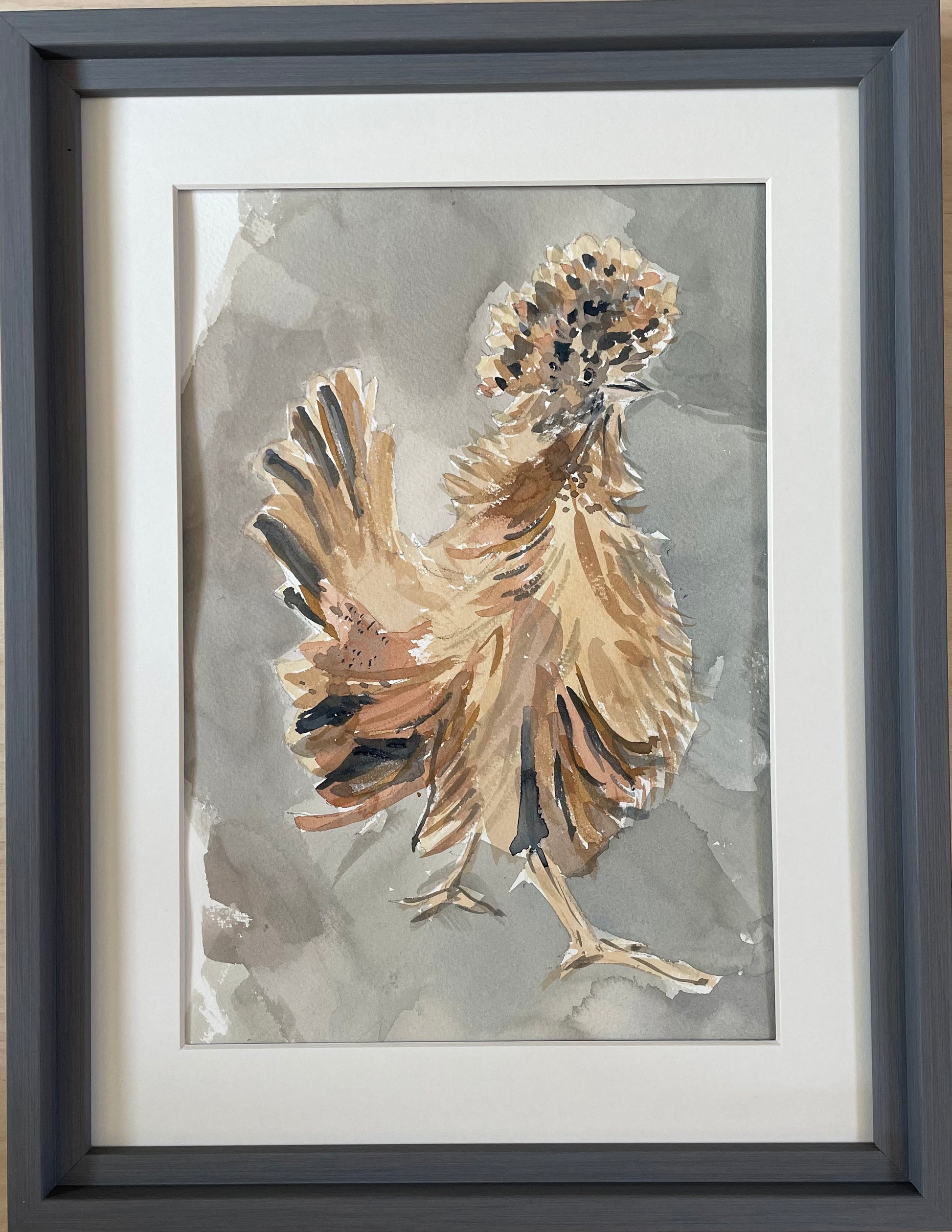 This is a watercolour of a Frizzle hen in pale creams and beige with a pale grey colour wash behind and signed.