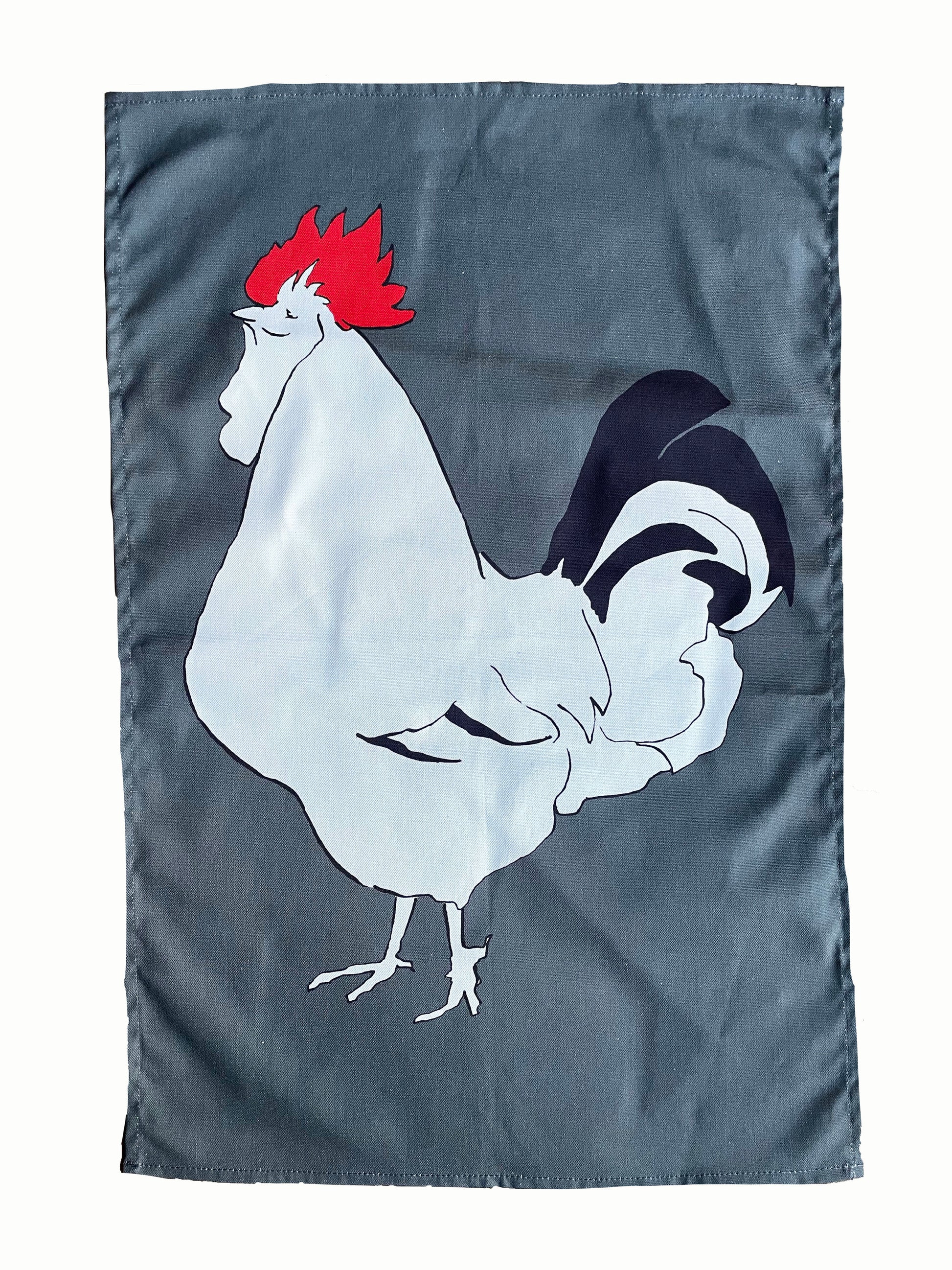 Grey tea towel featuring a Sussex cockerel. It comes with a black hanging loop and matches the new Aga toppers & Tote bags.
