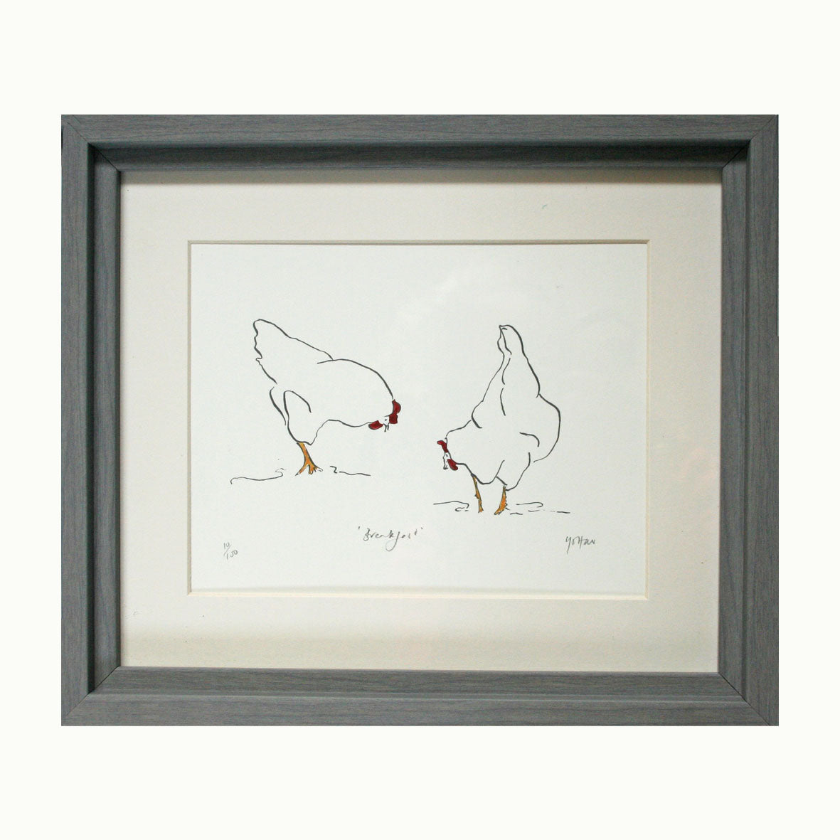 This print is a drawing of my hens in the garden at home, first thing in the morning when the treats are brought out!