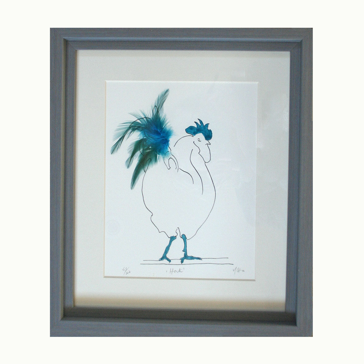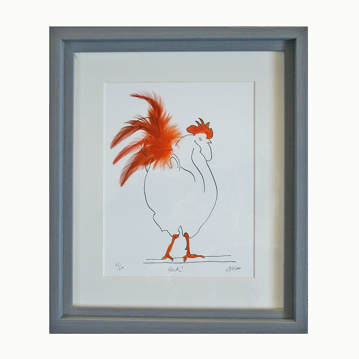 The signed Herk cockerel prints are an edition of 100, hand finished with watercolour and real feathers in Blue or orange. The print makes a good pair with the Oh La La Orange print.