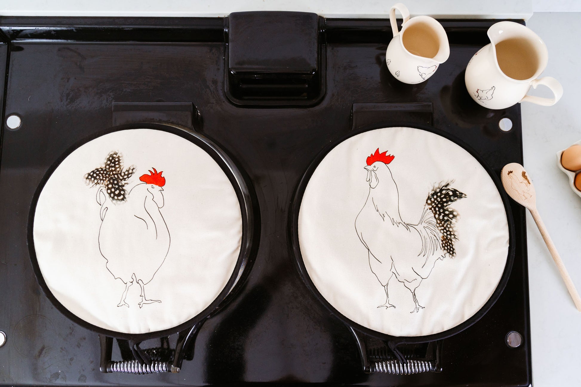 The Edward Cockerel Aga pad is edged in black look super smart on any aga range. This is one of our best selling designs.