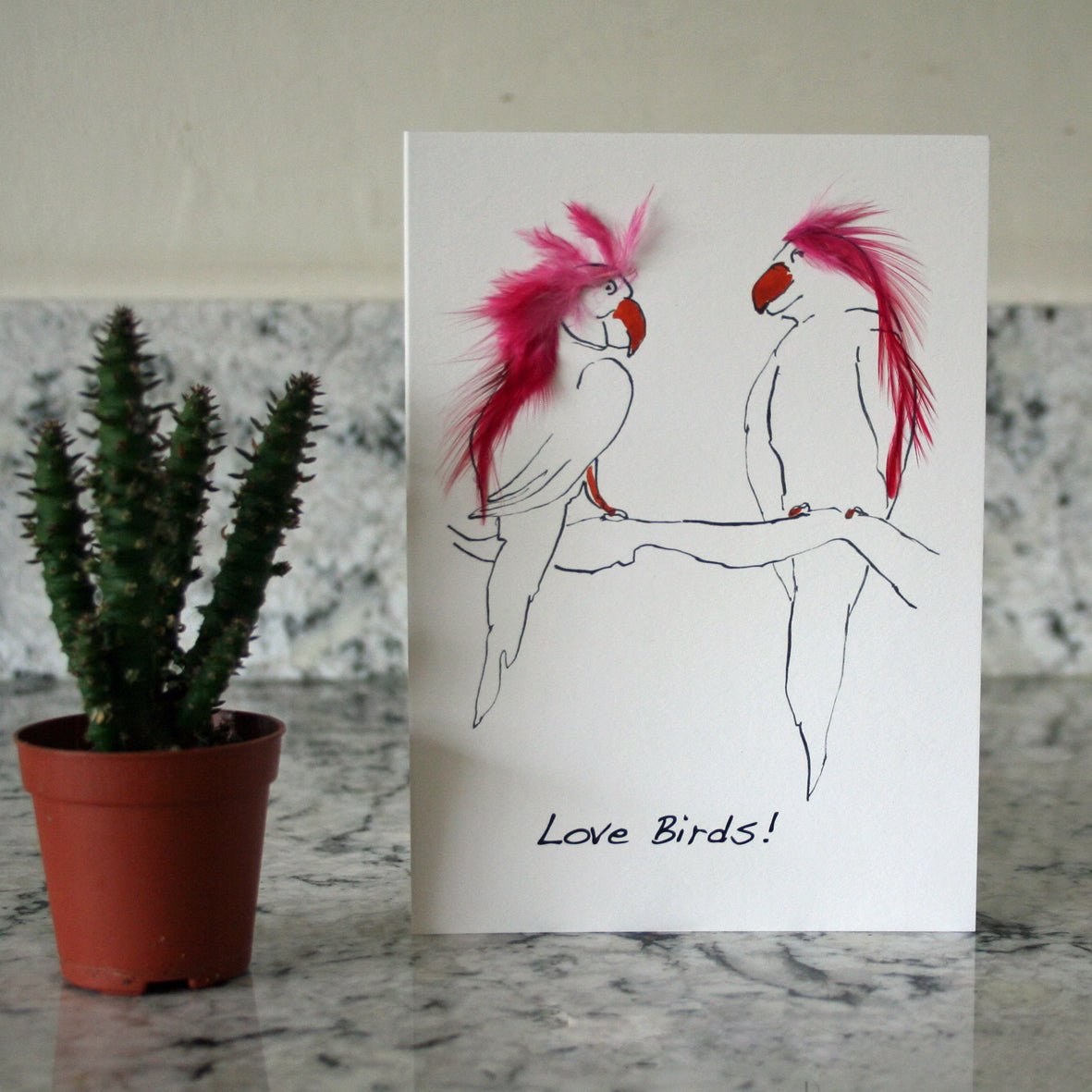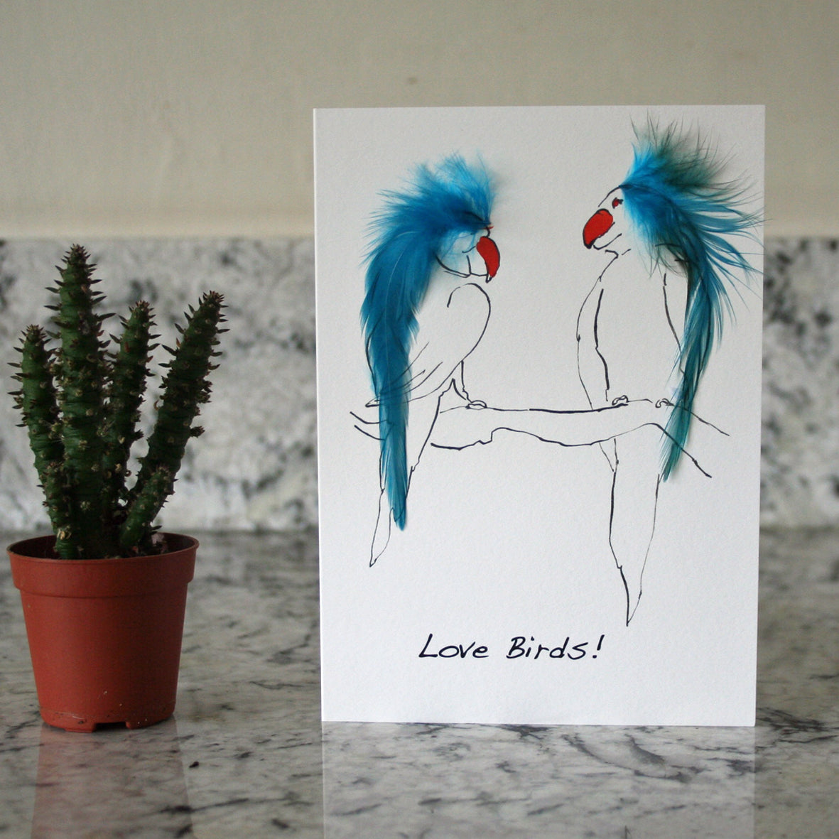 The Love birds are a pair of Parakeets. They are hand finished with real feathers and watercolour in a variety of colours.