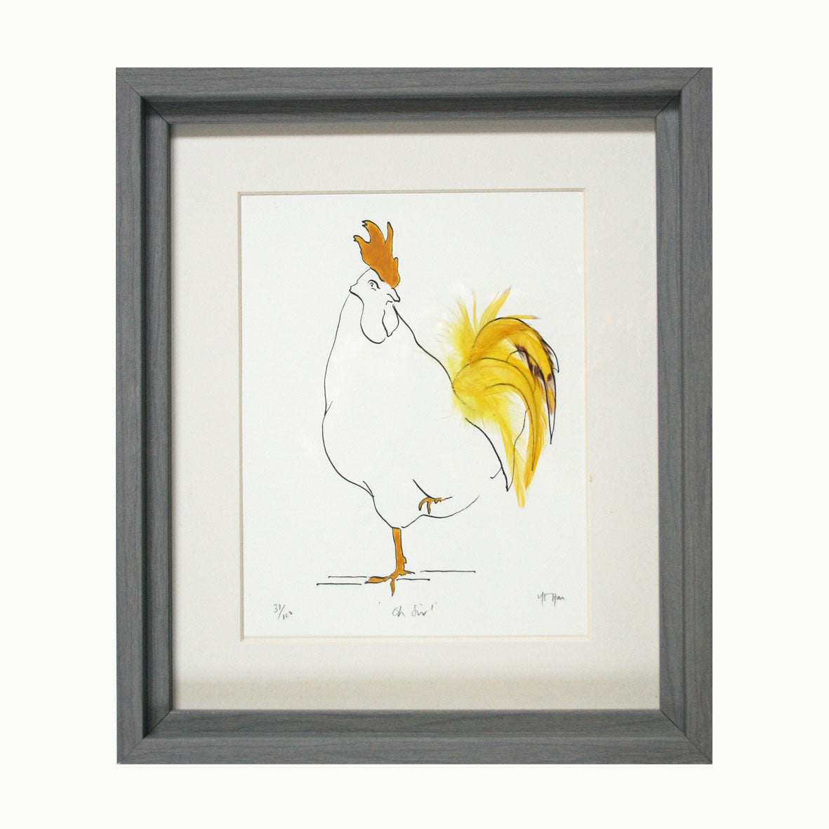 The signed 'Oh Sir!' mustard cockerel prints are available mounted or framed. This handsome chap is very popular.