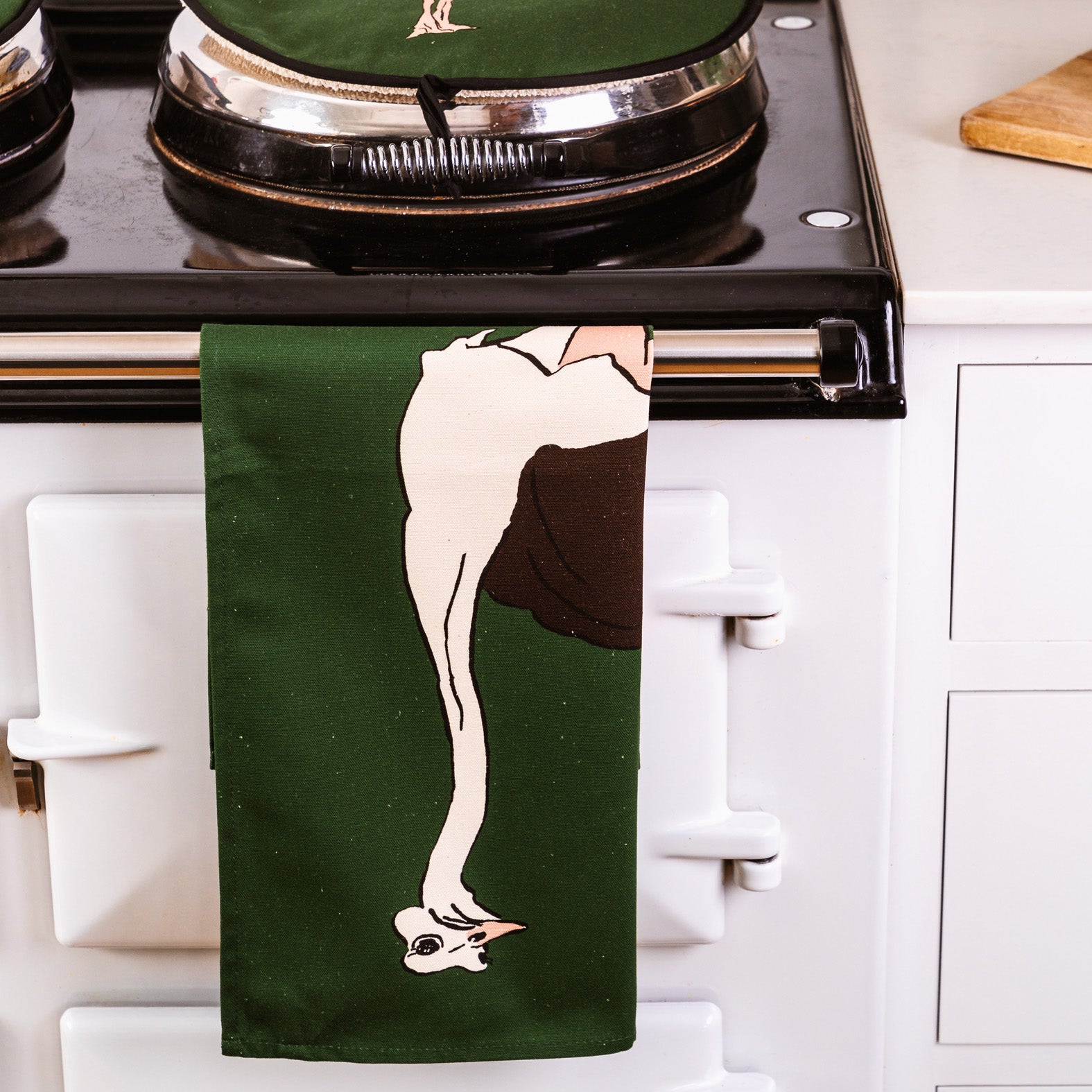 The tea towel features an Ostrich with deep green background and great legs and looks really striking in any kitchen.