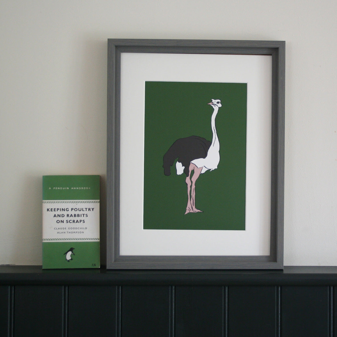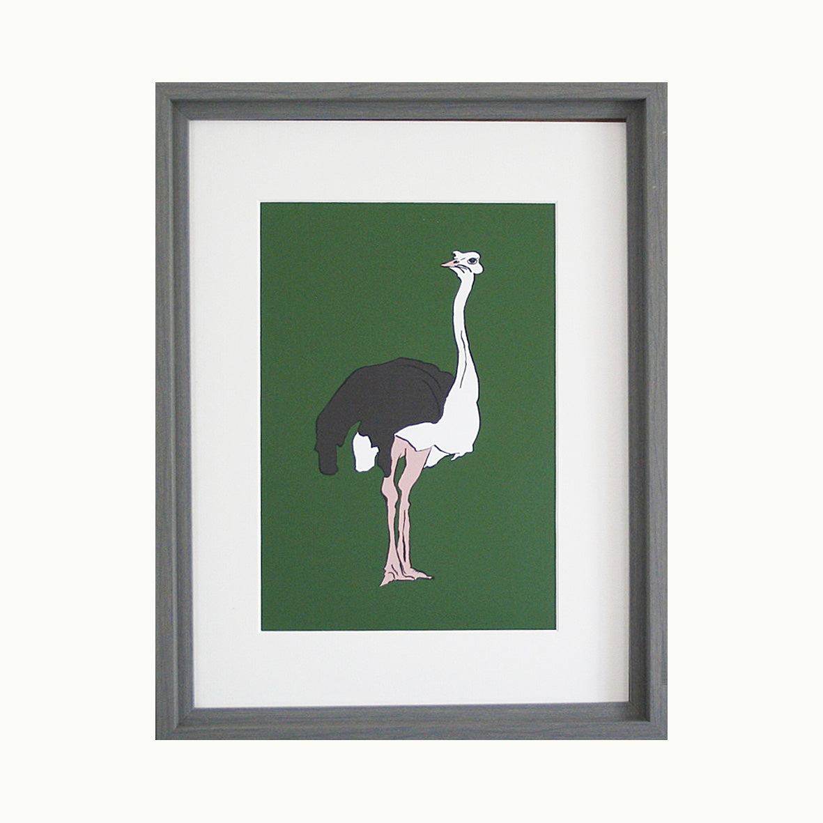 The Ostrich, with the fabulous pink legs is set off with a deep moss green background.