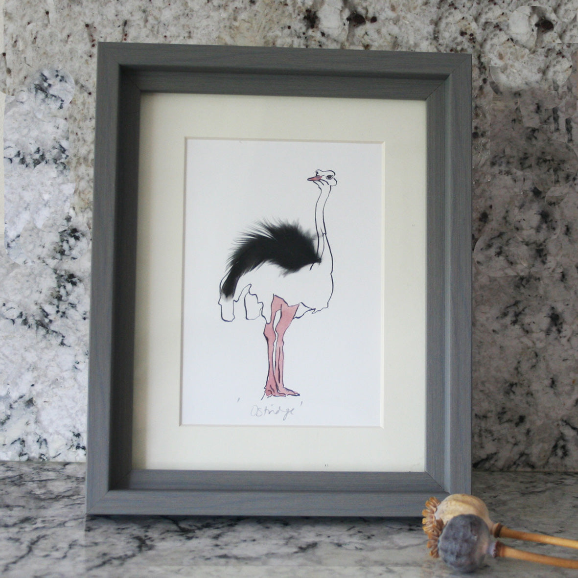 The Ostrich mini print is hand finished with real black feathers and watercolour in a coral colour.