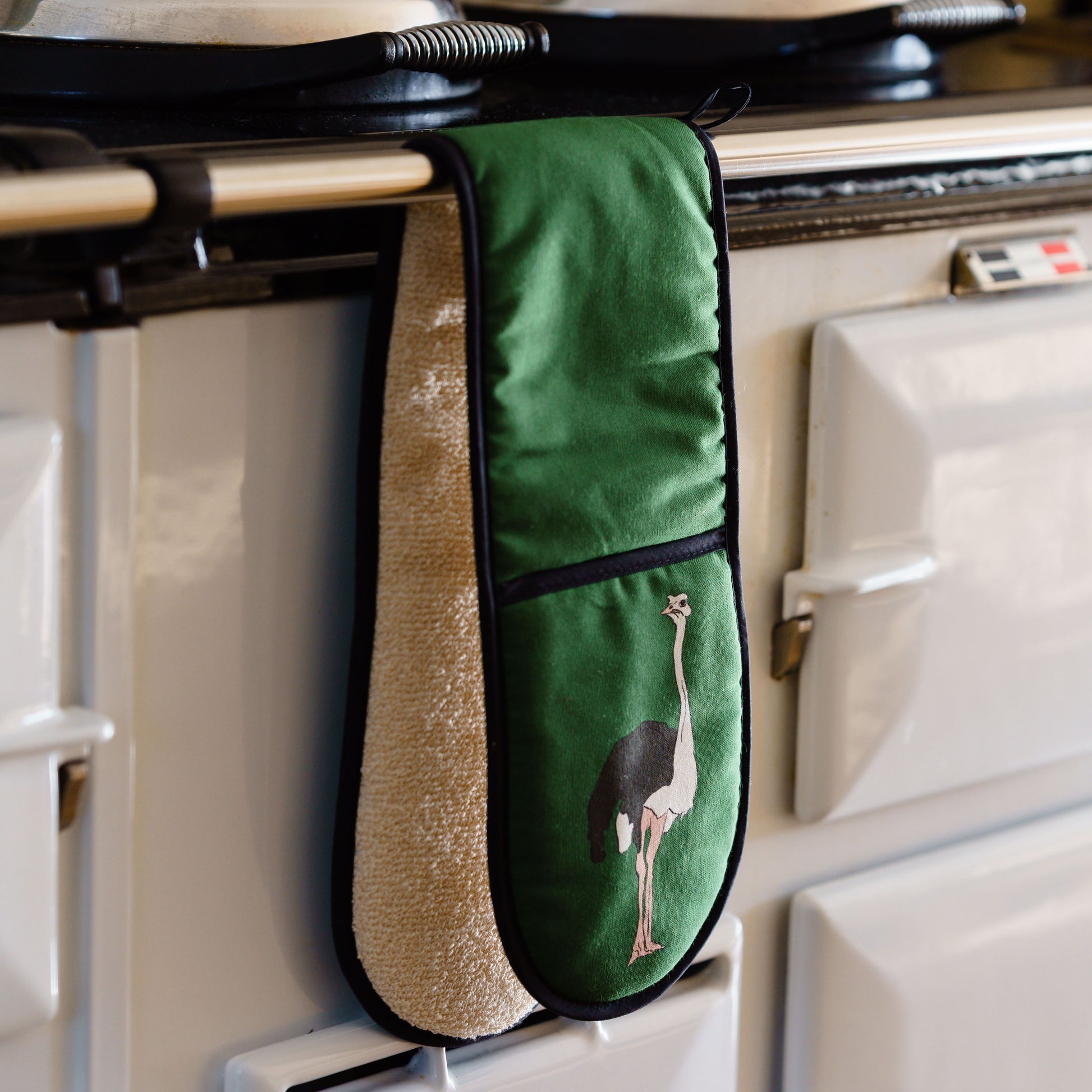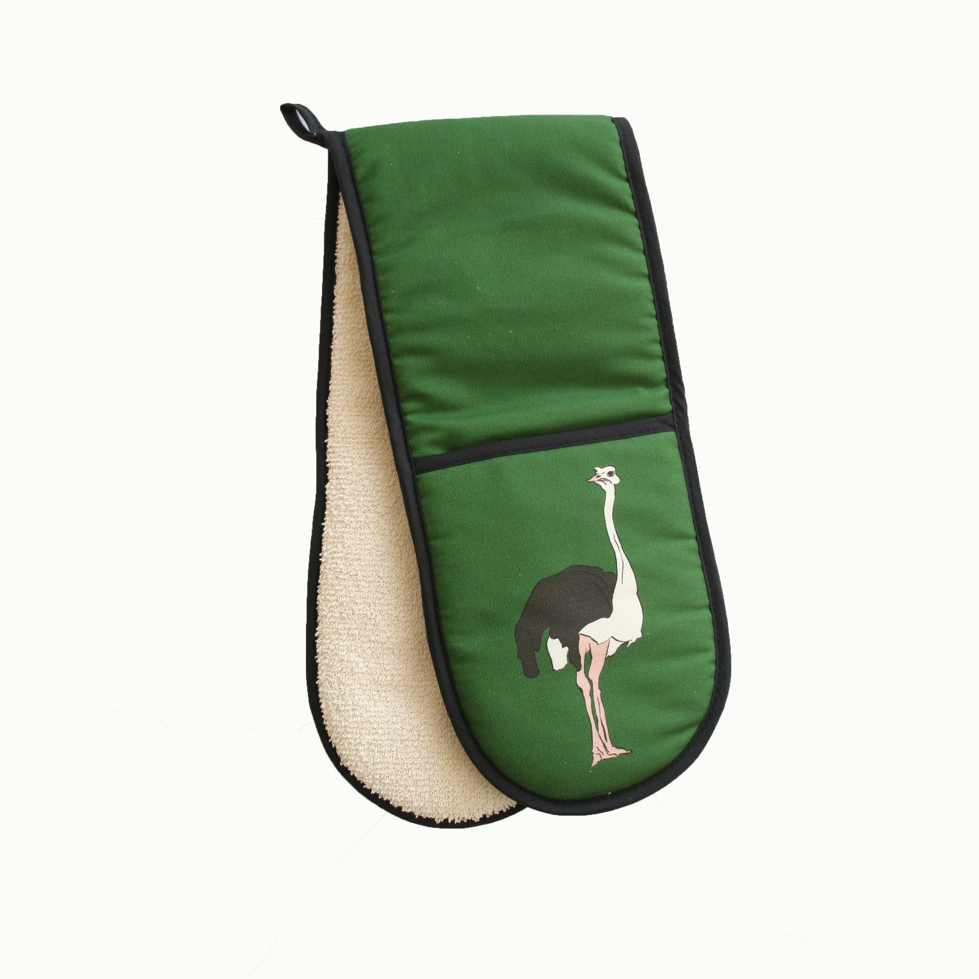The Ostrich double oven gloves are set on a racing green background a heavy weight heat-resistant towelling in cream. They have a handy hanging loop with the black edging.