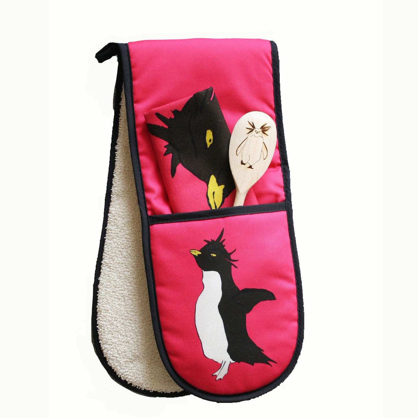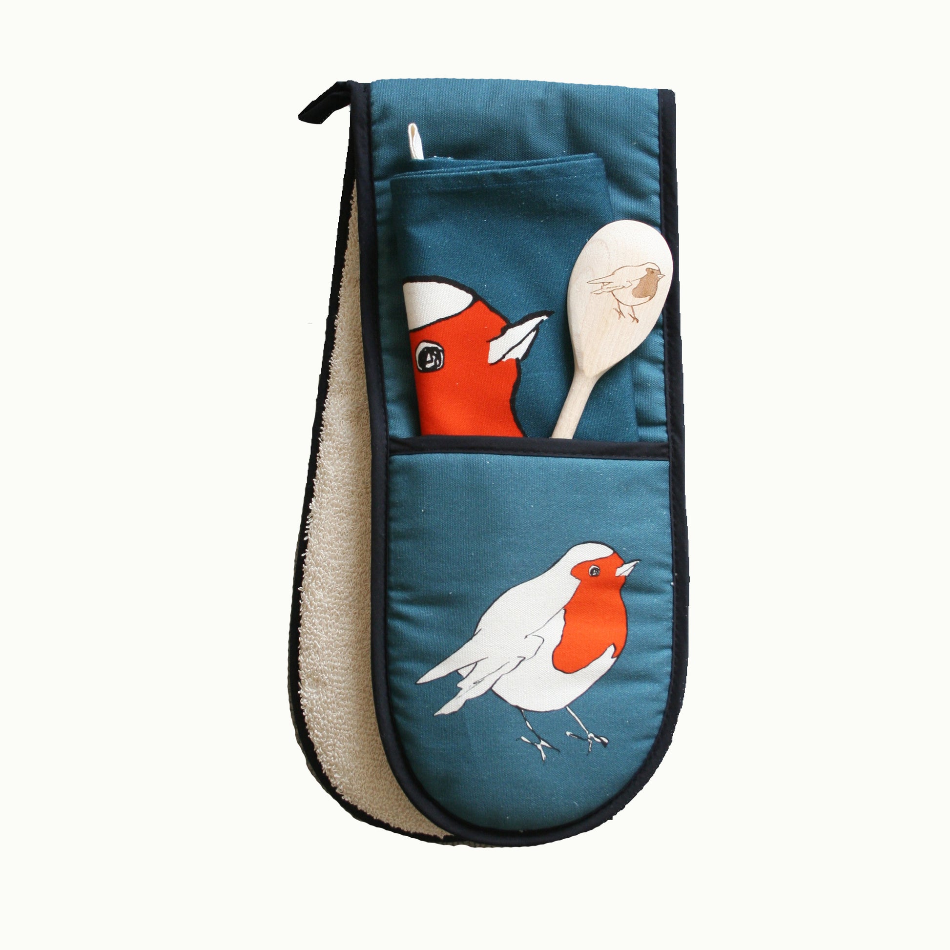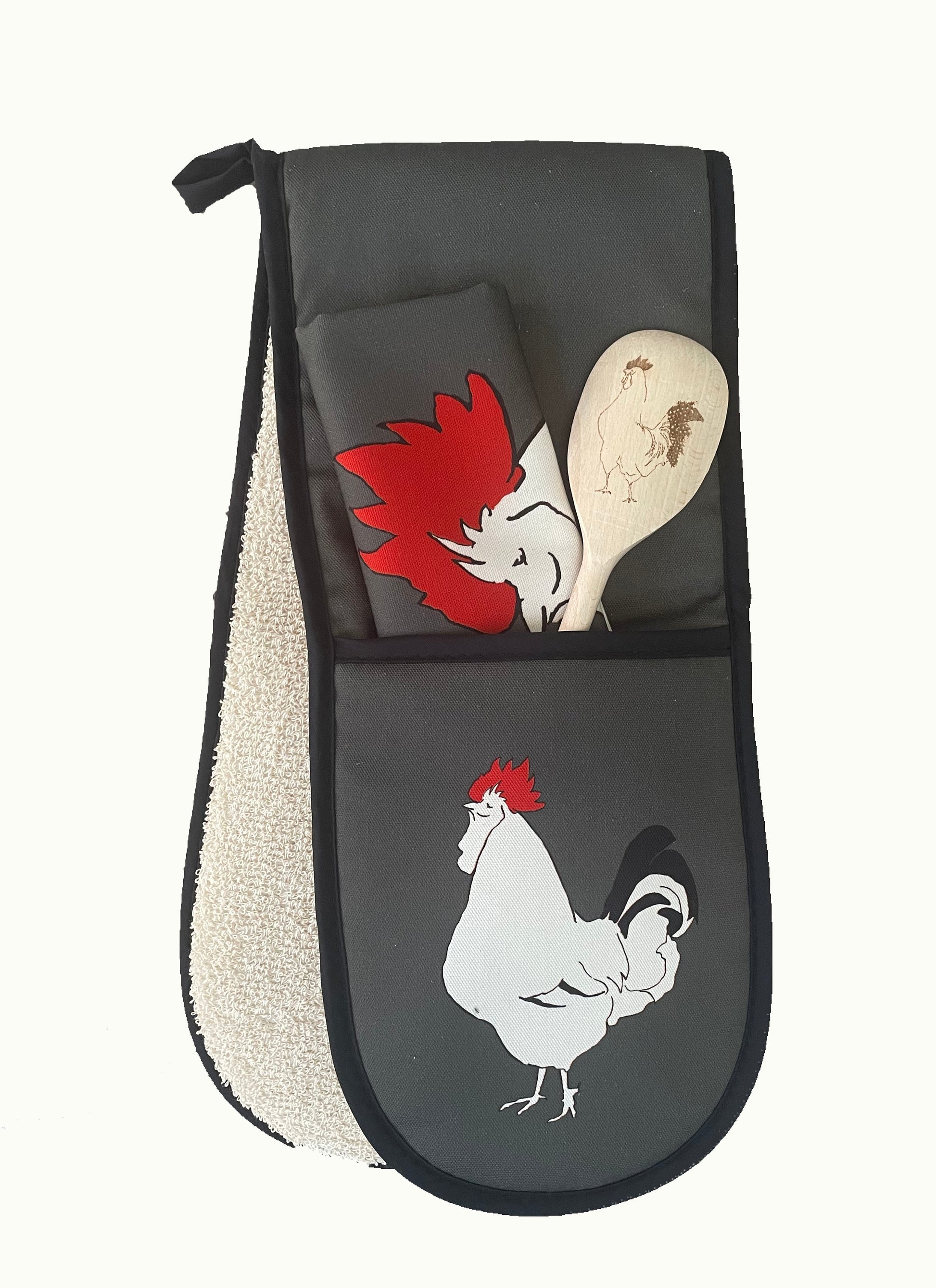 This set of a matching oven gloves & tea towel with an engraved wooden spoon make a great gift. A matching card is included too.