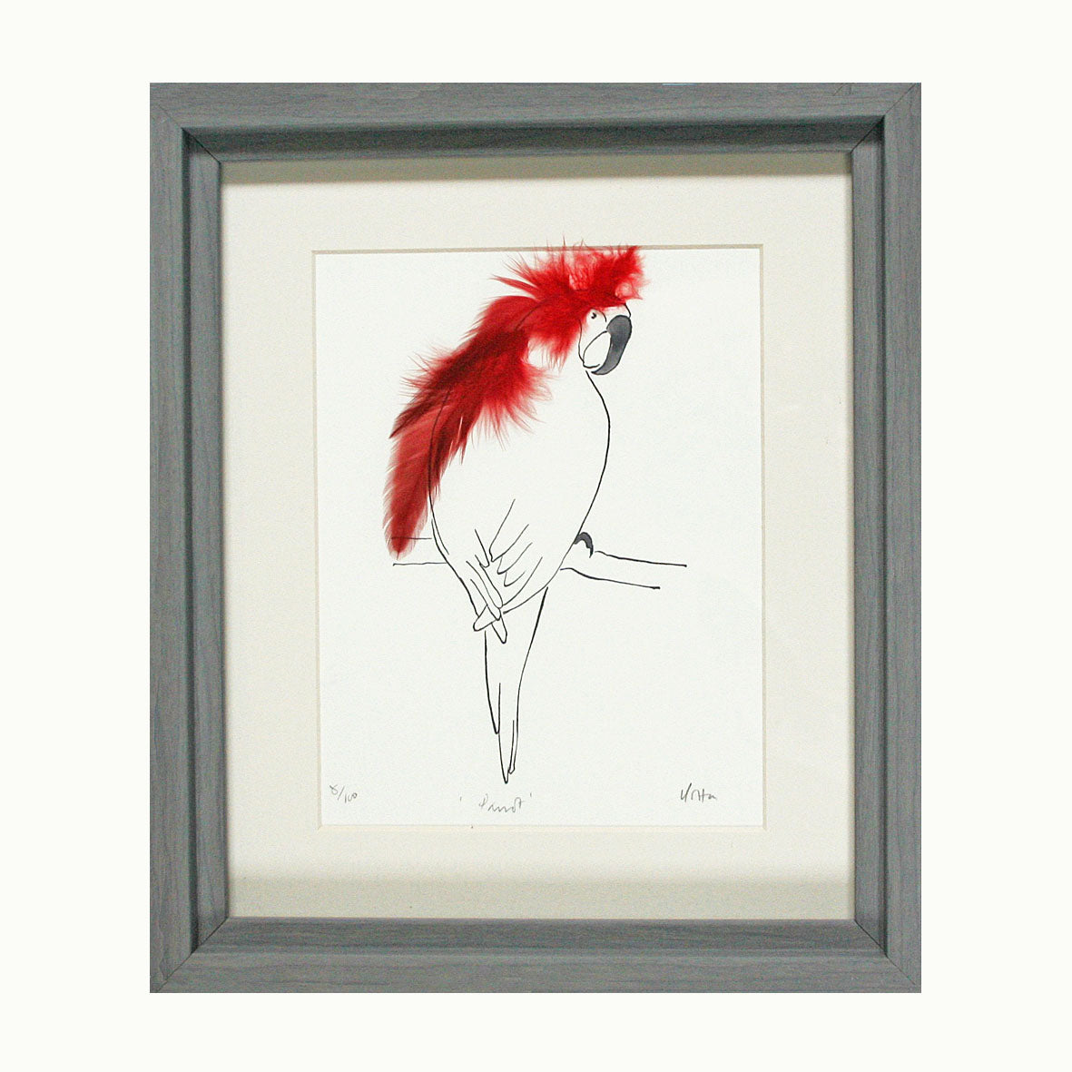 The signed Parrot prints are available mounted or framed. They are an edition of 100, hand finished with watercolour and real feathers. They are available in either red or blue.
