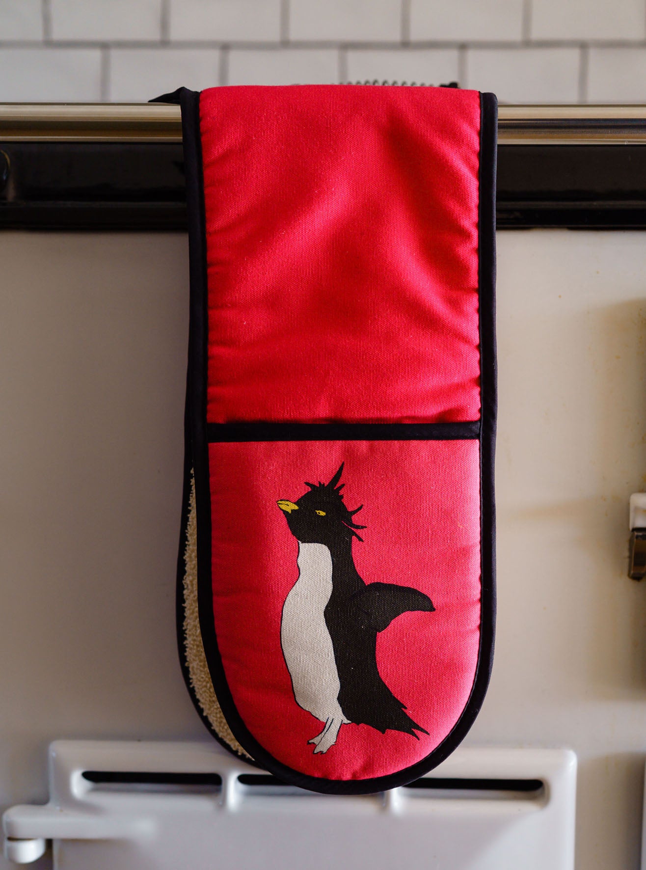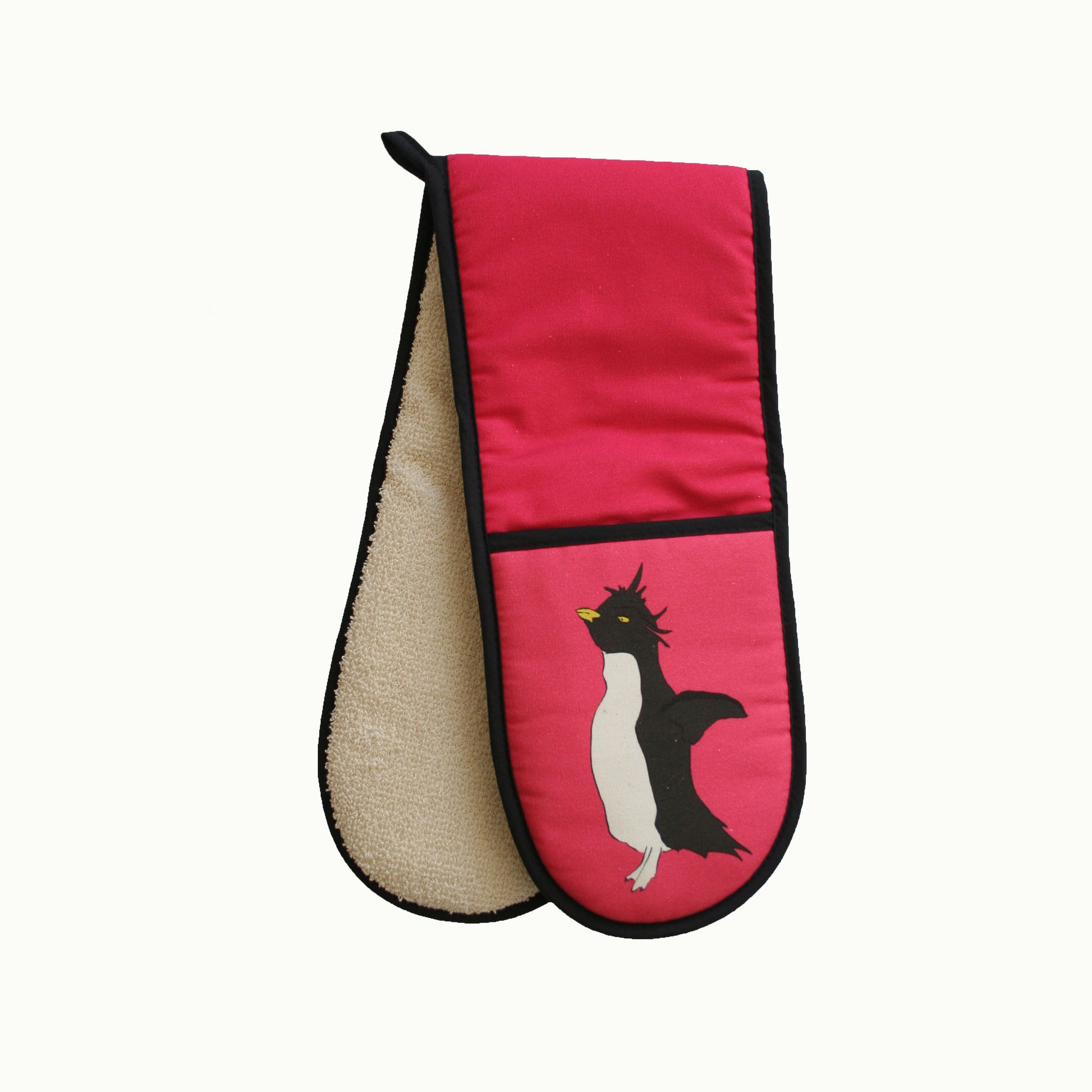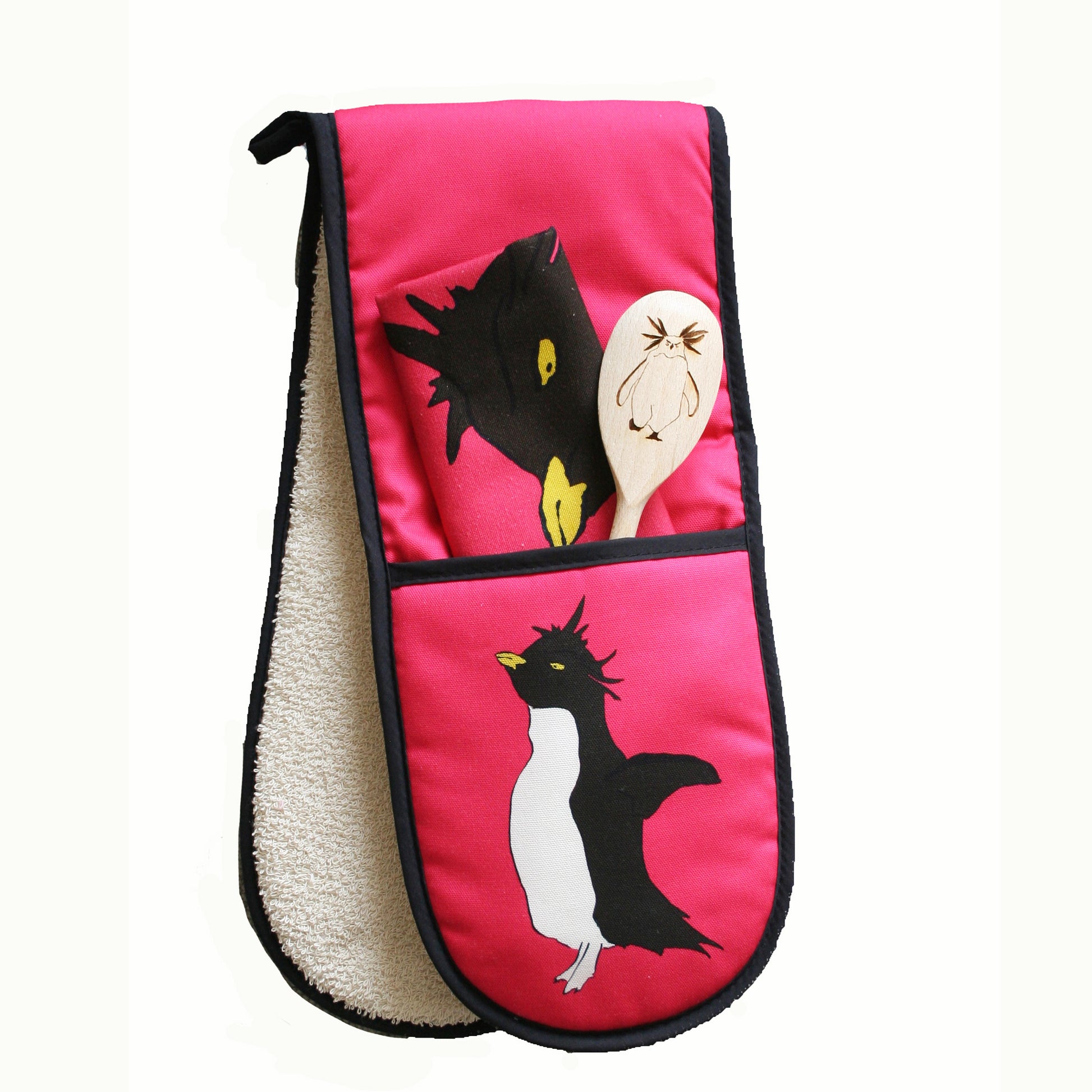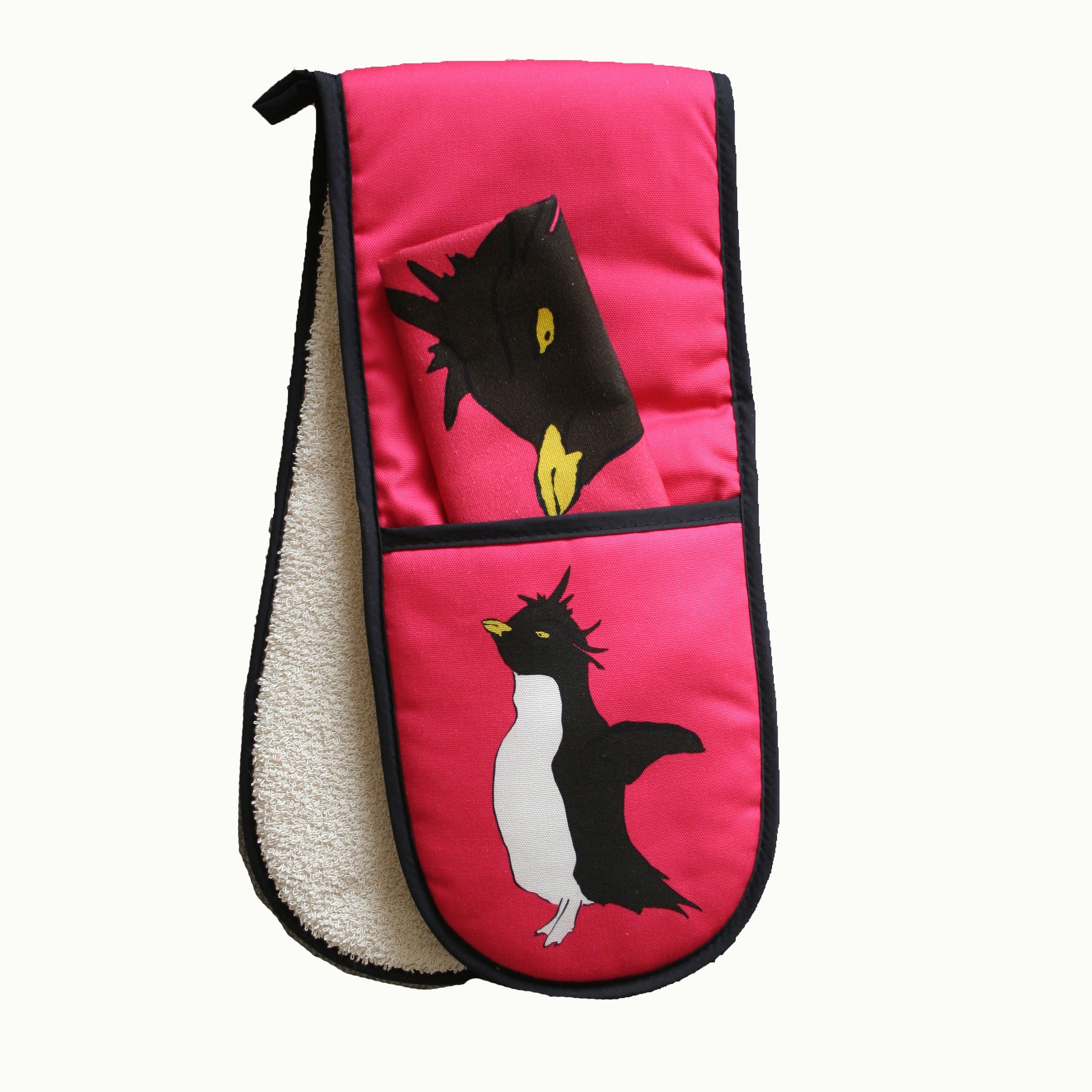 The Penguin double oven gloves are a wonderful bright pink with a heavy weight heat-resistant towelling in cream. They have a handy hanging loop with the black edging too.