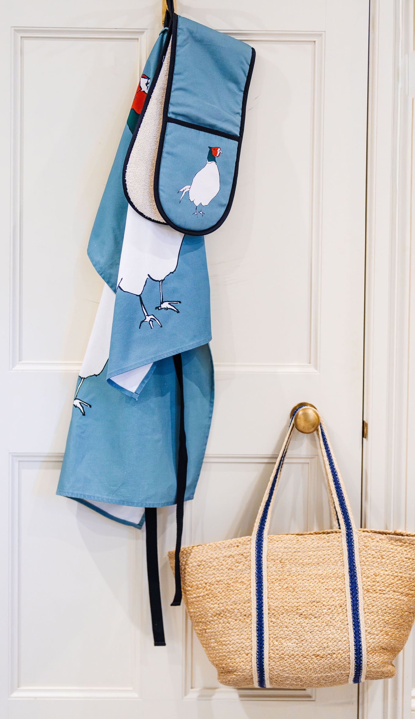 The pheasant double oven gloves are an eau de nile blue with a heavy weight heat-resistant towelling in cream. They have a handy hanging loop with the black edging too.