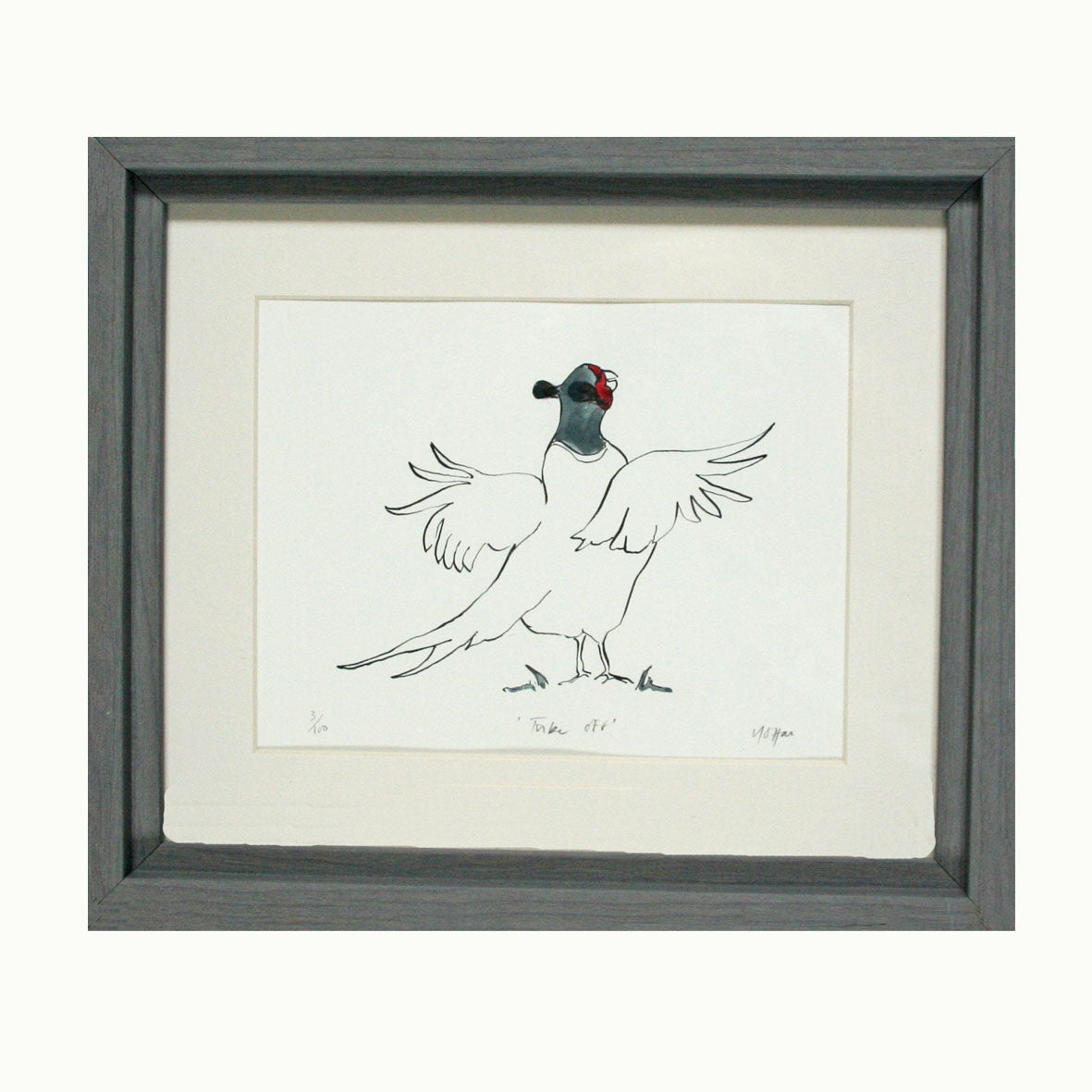 The signed 'Take Off' Pheasant prints are available mounted or framed. They are an edition of 100, hand finished with watercolour and a pheasant feather of their own.