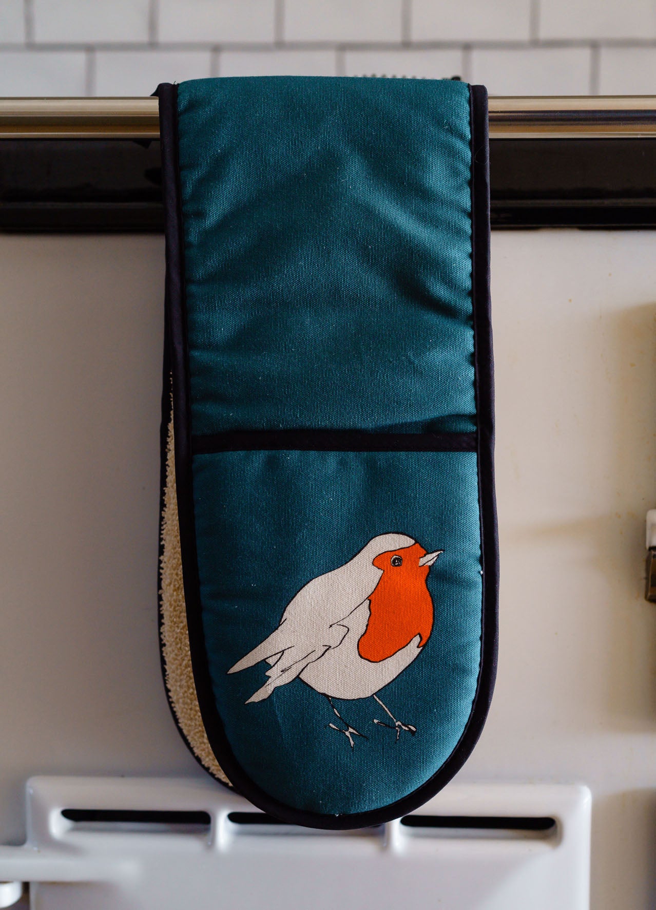 The Robin double oven gloves are set on a blue background a heavy weight heat-resistant towelling in cream. They have a handy hanging loop with the black edging.