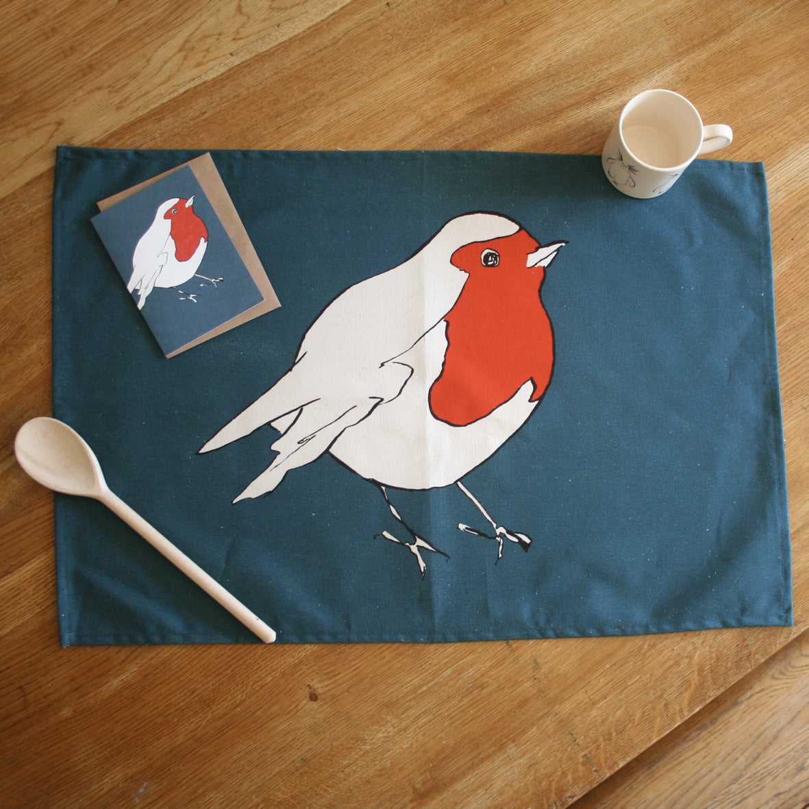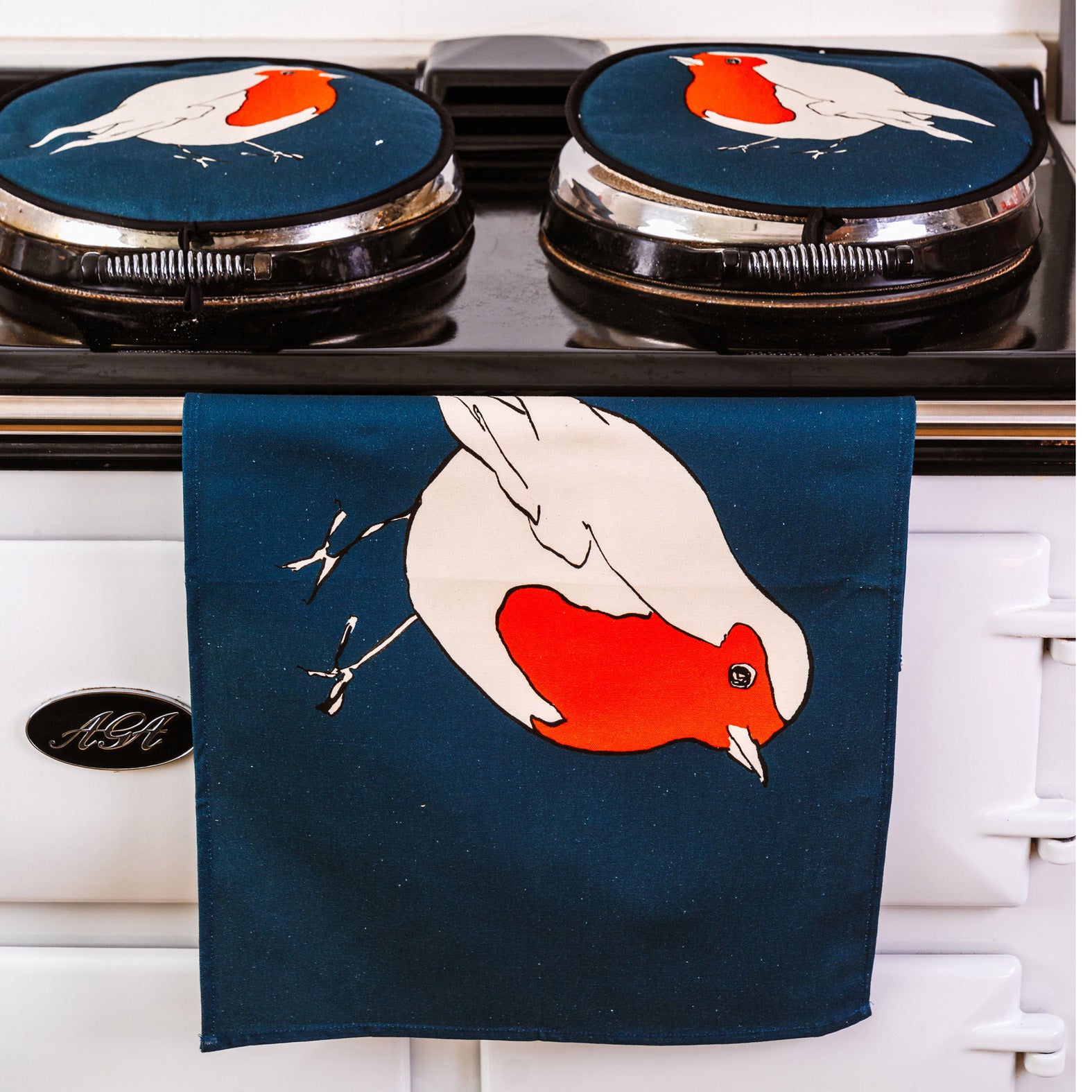 The tea towel features bright robin with his red breast on a blue background in this full colour print.