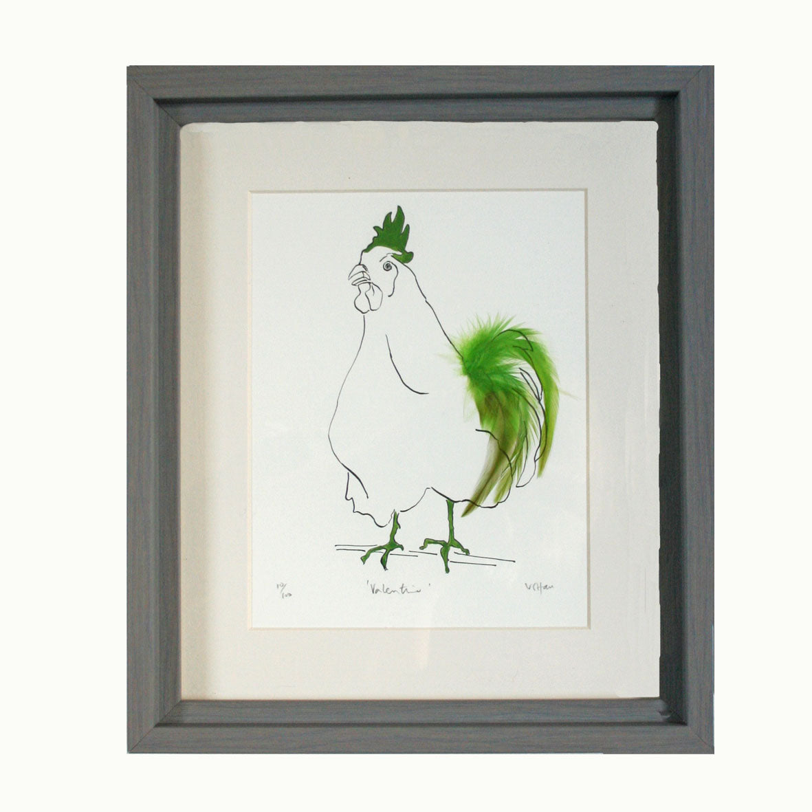 The signed 'Valentino' bright green cockerel prints are available mounted or framed. They are an edition of 100, hand finished with watercolour and green feathers.